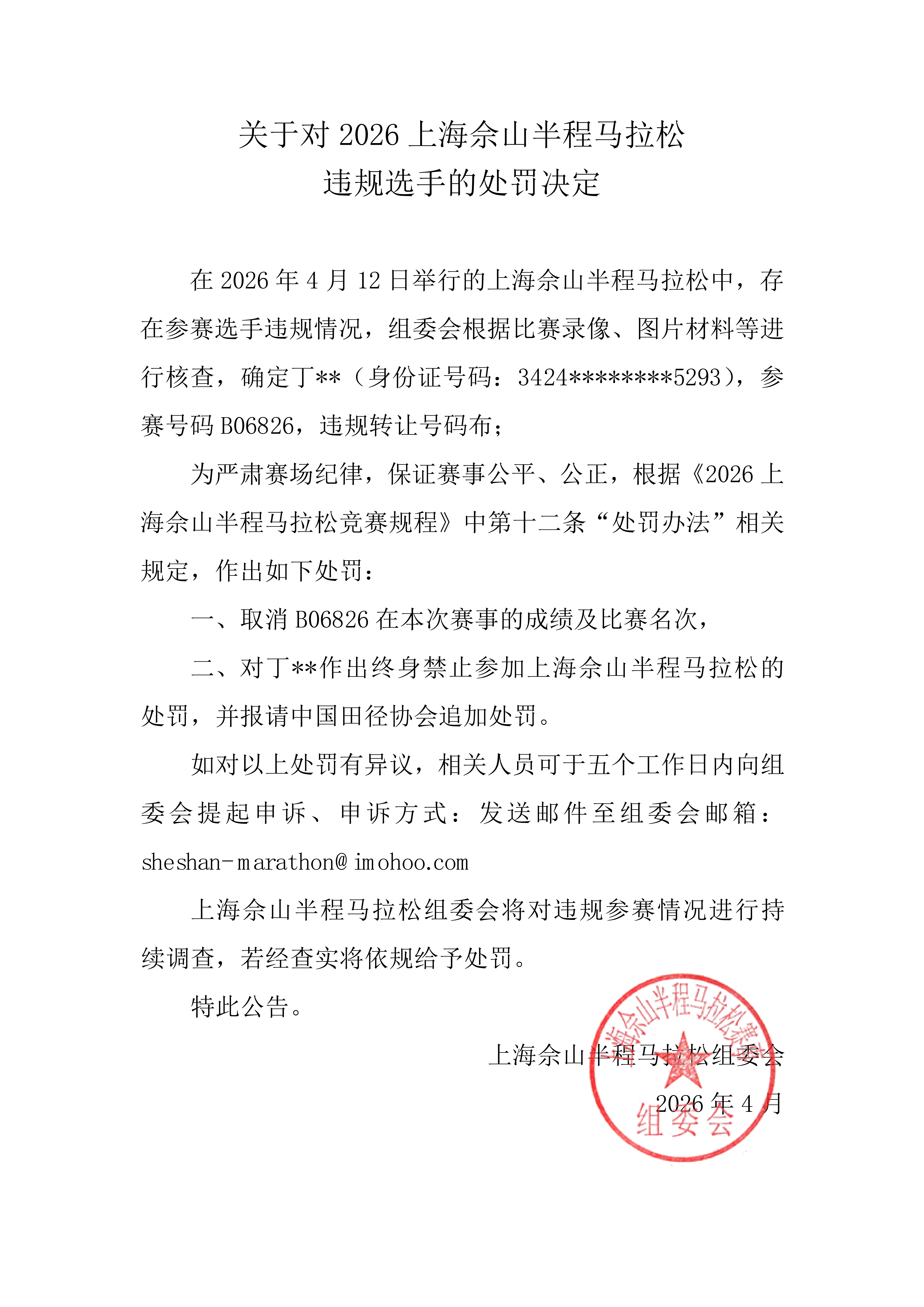 关于对 2026 上海佘山半程马拉松 违规选手的处罚决定